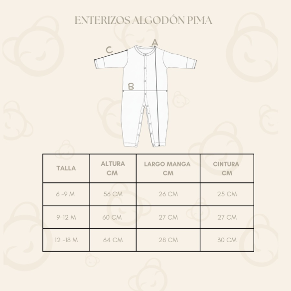 Enterizo confeccionado en 100% algodón pima, suave y delicado con la piel sensible del bebé. Su diseño cómodo y ligero permite libertad de movimiento durante todo el día. Cuenta con broches frontales que facilitan el cambio de ropa , cuenta también con mitones incluidos en las mangas y un estampado sutil que aporta ternura y frescura, ideal para el uso diario. Beneficios de las prendas al ser 100% algodón Pima: